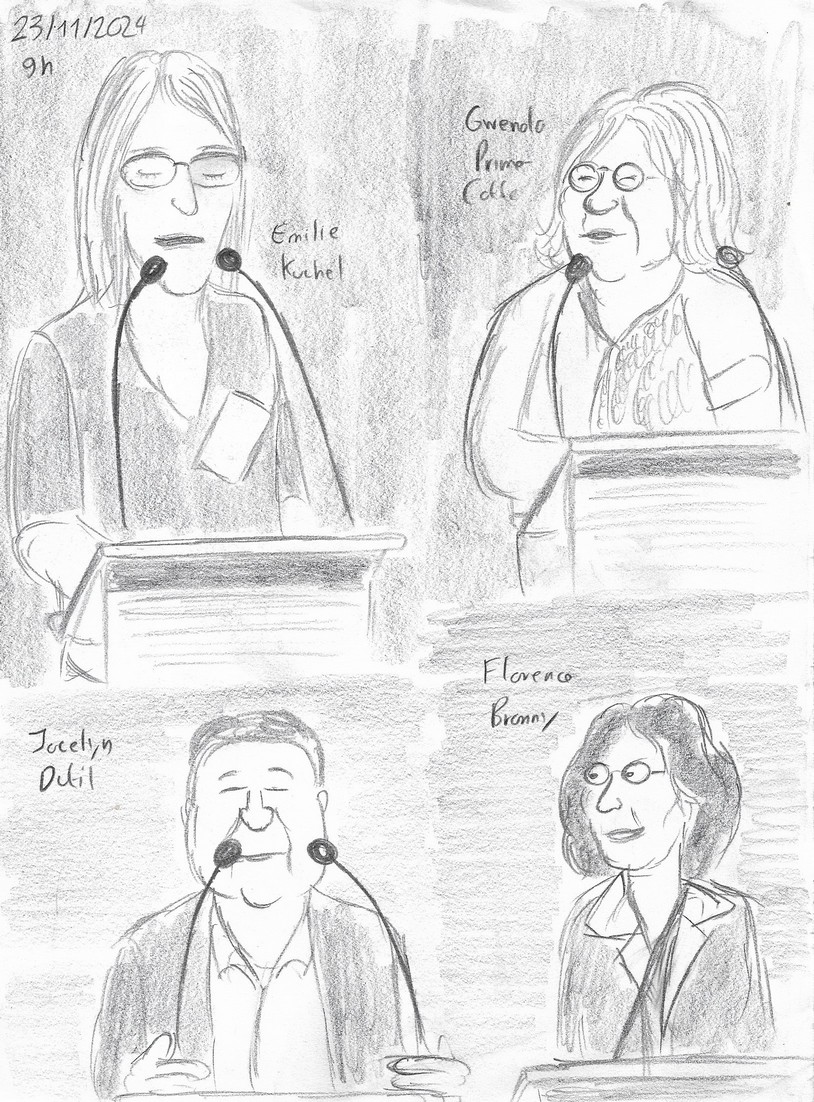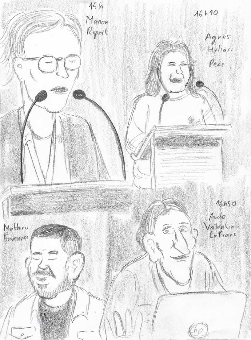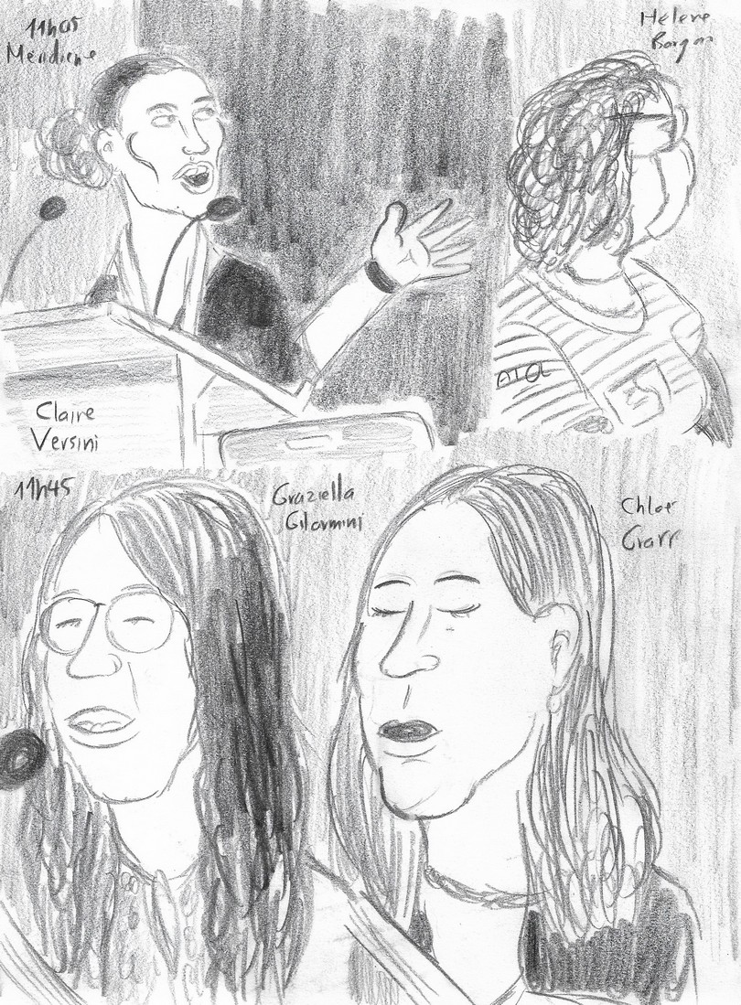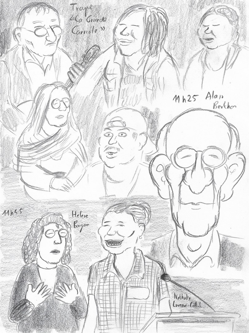 11h05 : Me voici dans la méridienne. Cette fois, il n’y a pas de caméra : pour rappeler ma présence, je pose mes dessins sur les marches qui mènent à l’estrade. Je suis obligé de déranger l’une des oratrices pour qu’elle me rappelle son nom ! J’en fais autant avec Hélène Bargain qui est assise à côté de moi mais que je ne reconnais pas sous son masque et que j’ai dessinée pour boucher un trou… Je me sens horriblement sans-gêne, mais c’est uniquement dans l’intérêt de ma prestation, j’en fais le serment !