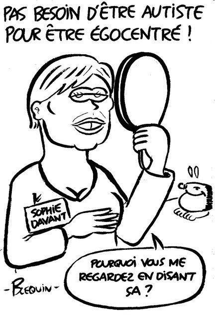 11h40 : Alors que débute une communication traitant des sujets avec autisme, je commence à me sentir plus à l’aise, suffisamment en tout cas pour renouer avec mes habitudes et saisir le premier prétexte venu pour égratigner mes têtes de turc préférées. Je commence avec Sophie Davant, devenue à mes yeux l’incarnation du narcissisme depuis qu’elle a osé lancer un magazine à son nom ! Et comme c’est quand même un joli brin de femme, ça me permet de ne pas passer mon temps à dessiner des sales gueules…