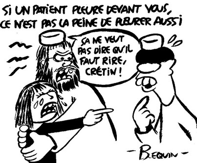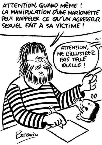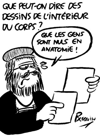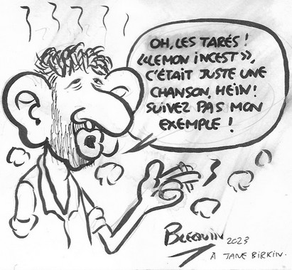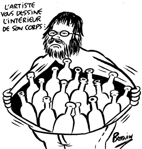 10h15 : C’est l’heure de la pause. Avant de rejoindre mon stand où mon public m’attend déjà (depuis hier, il y a un attroupement à chaque fois), je me fais servir un thé, un jus de fruit et quelques viennoiseries pour être sûr de tenir le coup avant le déjeuner. Une fois revenu, je fixe sur les panneaux les premiers dessins de la journée : je commence à prendre le pli et je rustine moins, en tout cas suffisamment peu pour pouvoir les afficher tous sans avoir à attendre que la gouache blanche soit sèche. Je termine quand même, devant témoins, un dessin représentant Gainsbourg dont j’avais eu l’idée en entendant une congressiste parler d’une patiente victime d’inceste : au moment où je m’apprête à y mettre la dernière main, je renverse mon gobelet de thé sur la table ! Plus de peur que de mal, heureusement, mais mon dessin est maculé : tant pis, je le laisse tel quel, cette saleté va plutôt bien à un sujet comme Gainsbarre ! Une dame est déçue d’apprendre que je vais passer la suite de la matinée dans la méridienne où sont annoncées des communications qui m’intéressent davantage : elle aurait voulu que je croque deux de ses collègues… Tant pis, ce qui est dit, j’ai même une chaise réservée dans la méridienne et je ne suis pas homme à changer mes plans dans la dernière seconde !