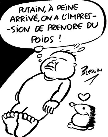 8h : Retour au Quartz. J’ai peu dormi cette nuit mais, à tout prendre, j’aurai quand même été plus raisonnable que les congressistes qui, à ce qu’on me dit, ont fait la bringue hier soir ! L’intérêt que mes gribouillages et mon Voyage en Normalaisie ont suscité m’ont incité à apporter un présentoir pour proposer aux gens de les caricaturer ainsi que mes recueils de dessins satiriques pour les vendre. Je crains qu’on m’oppose que je n’en ai pas le droit, comme c’est déjà arrivé à la PAM, mais il ne se passe rien de tel, les organisateurs semblent mêmes ravis de mon initiative ! Je retiendrai que les scientifiques sont moins chiants que les commerçants – mais ça ne m’étonne qu’à moitié !