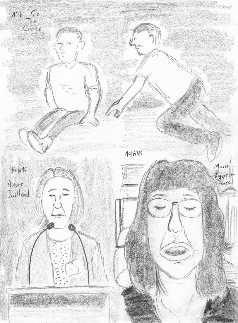 14h : L’après-midi débute avec un autre intermède artistique assuré par le clown Jonathan Roudaut. Pas un clown qui fait rire, pas non plus un clown maléfique : plutôt un clown qui est en train de se révéler à lui-même sous nos yeux en tant que clown et qui doit réapprendre à maîtriser son corps visiblement meurtri… Il n’y a de lumière que sur la scène, l’obscurité est totale dans le théâtre, même la lumière dont je disposais ce matin a été éteinte : comme ce spectacle ne m’intéresse que modérément (j’ai l’impression d’avoir vu dix mille fois des gesticulations de ce genre), j’utilise donc la torche de mon téléphone portable pour pouvoir faire un croquis. Personne ne proteste, alors je persiste. Je me demanderai toujours comment faisait Cabu pour prendre des croquis dans les salles obscures…